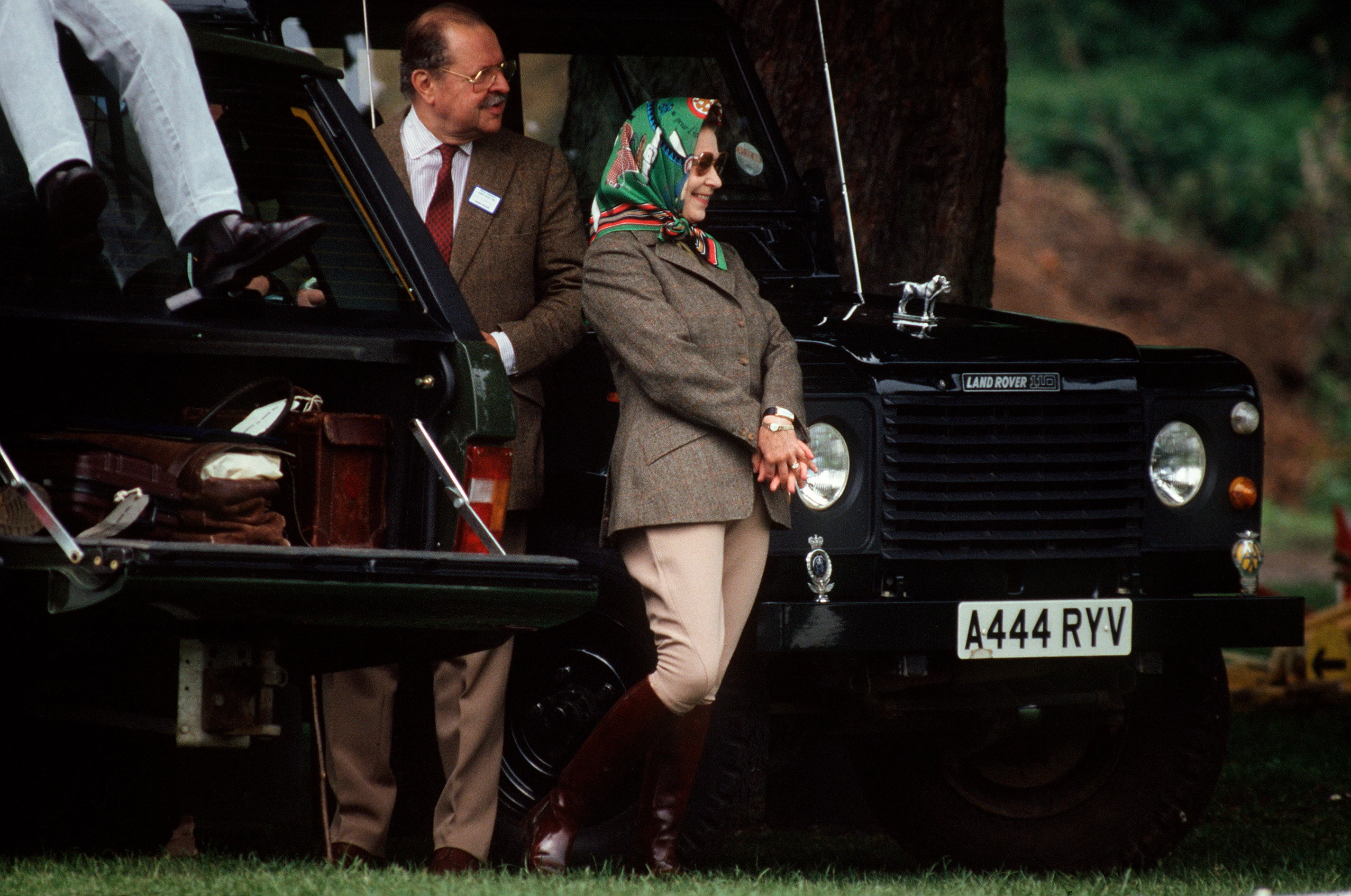 Lovaglónadrágban és fejkendőben Erzsébet királynő a windsori lovaskiállításon, 1988-ban
