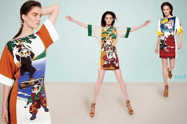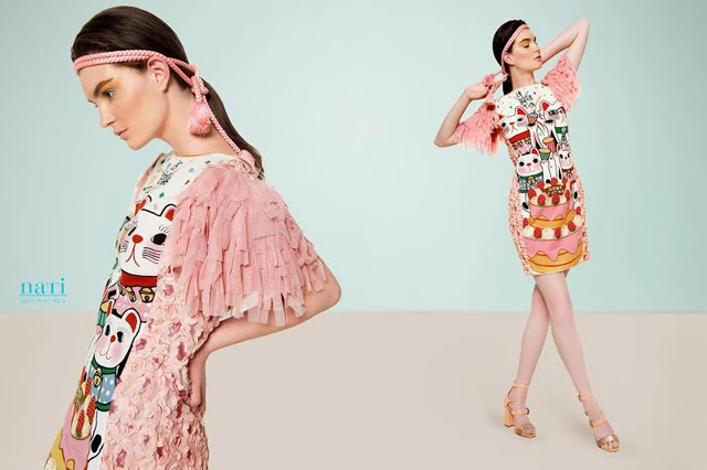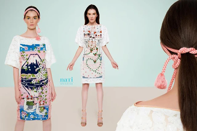 A Catsmopolitan egészen más. Ez egy visszatérő téma egyik darabja, tulajdonképpen egy trilógia harmadik része. 2012-ben készítettem el a Manekineko Love-ot, ami a cicás sorozat első felvonása volt. Ehhez eredeti Japánból beszerzett printelt anyagokat használtam. A sorozat második darabja, a Manekineko Love - Special Xmas Edition pár évvel rá jelent meg. A Xmas Edition karácsonyi glamúros hangulatot közvetített, más fazont használtam ennél, és ez így maradt a harmadik szériára is. A Catsmopolitan is három részre tagolódik; casual, kimonós stílusú ruhák a lezserebbeknek, egy nyaralás tematikára reagáló kollekció, olyan témákkal, mint kirándulás, napozás vagy napraforgószedés, és végül egy esküvői szekció is.