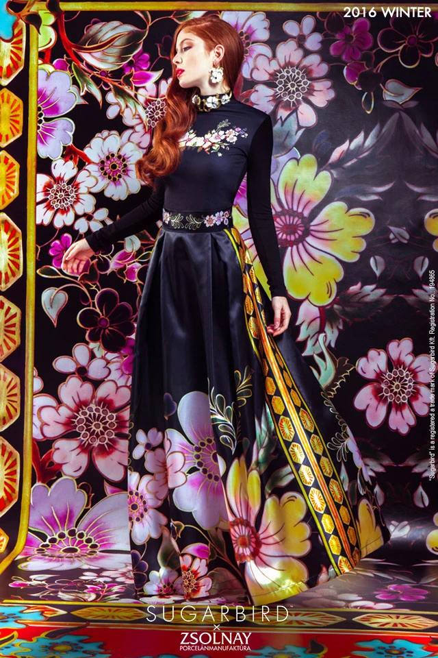 Az első kollekcióban fontosnak tartottuk, hogy azokat a Zsolnay mintákat használjuk, amik a legelterjedtebbek/leghíresebbek, hogy első ránézésre felismerhető legyen a vásárlók számára, hogy ez egy Zsolnay motívum. Illetve az első ruhákhoz 6 vázát használtunk, ezáltal több kisebb csoportra osztható maga a kollekció, (3 geometrikus mintás neccruha, 3 pillangó mintás ruha, stb), és öten dolgoztunk rajta, mindenkinek a terveiből válogattunk. A legújabb kollekció viszont nem osztható több kisebb csoportra, mert nagyjából minden ruhához használtam ugyanazokat a virágokat, illetve szabad kezet kaptam grafikailag Héditől olyannyira, hogy én választhattam ki, melyik vázákat szeretném használni, milyen színvilág és nagyjából milyen fazonok kapjanak helyet a ruhákon. Amit mindenképpen szerettem volna készíteni, az egy nagyon színes, tele nyomott téli kabát. És szerencsére elfogadták a tervemet!