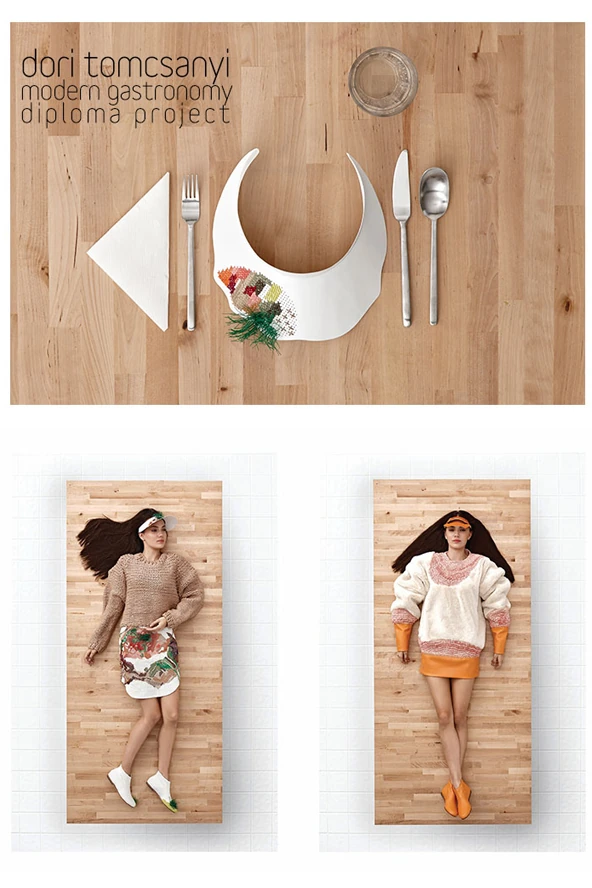 Tomcsányi Dóri a testen tálal. A Moholy-Nagy Művészeti Egyetemen végzett tervezőt a kortárs gasztronómia és az öltözéktervezés átjárásai izgatják, diplomájában öt ételhez öt öltözék kapcsol.