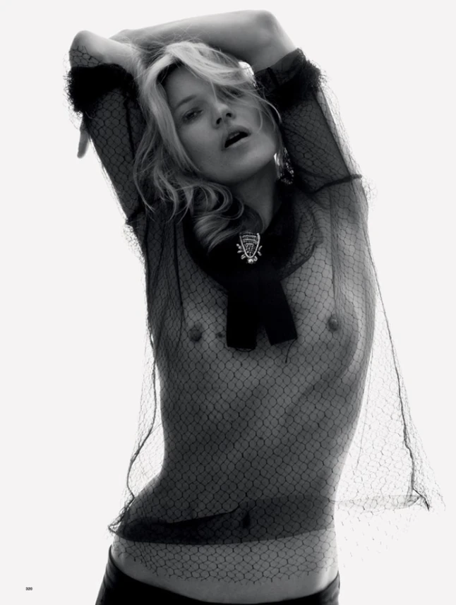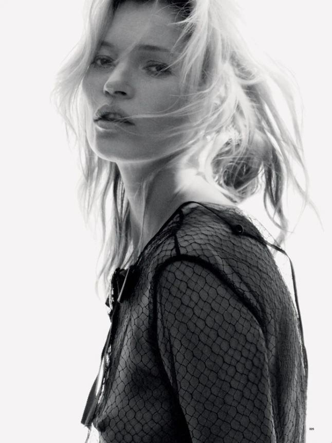 A 41 éves, éppen válófélben lévő szupermodell a divatrajongók számára egyszerűen megunhatatlan. A divatmagazinok szerkesztői legalábbis továbbra is lázban tartja az első számú angol stílusikon. A frissen megjelent Love magazin ráadásul tényleg függője a modellnek, láttuk már leszbikus csókot váltani a címlapon, vagy alig ruhában a kádban. Most újra övé az egyik címlapverzió, és David Sims egy nagyon intim fekete-fehér sorozatot készített róla. Kate Moss ugyan visel ruhát a képeken, de szinte csak azért, hogy ezzel még inkább arra koncentráljuk, hogy villant a képeken.