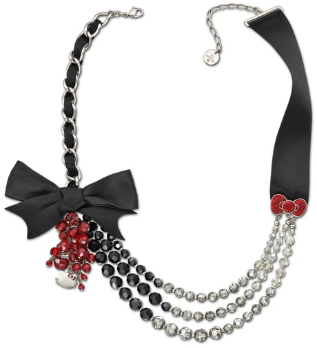 A Hello Kitty Glamour ékszerkollekció nagyon nőies és természetesen nagyon glamúros. A nyaklánc harmonikusan kombinálja a szalagot a fekete szatén masnival és egy elegáns lánccal, amely három kristályfüzérben folytatódik, árnyalt átmenettel az átlátszó és fekete kristályok között. A masniról függő piros kristályalmák alkotják az aszimmetrikus nyaklánc ellenpontját. A szetthez ezenkívül egy háromsoros karkötő és két pár fülbevaló tartozik, amelyek az elegáns piros kristályalmákat piros, fekete és átlátszó kristályokkal egészítik ki.