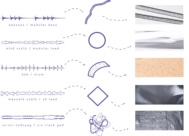 A kollekció különböző anyagai – PVC fólia, cérna, bőr, kötél és szivacs – a zene szólamainak változását követik, és Alpár komponálásával párhuzamosan váltakoznak a tervezők darabjain. A lányok nem csak a ritmust, de az adott hangsávok karakterét is leképezték a divat nyelvére; a felhasznált alapanyagok szerkezete megegyezik az adott szólamokkal, így például az improvizatív hangsáv egy szintén improvizatív varrásos mintának felel meg.