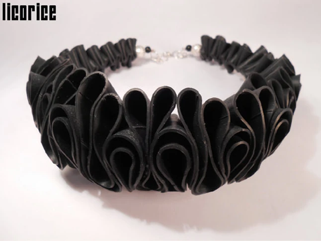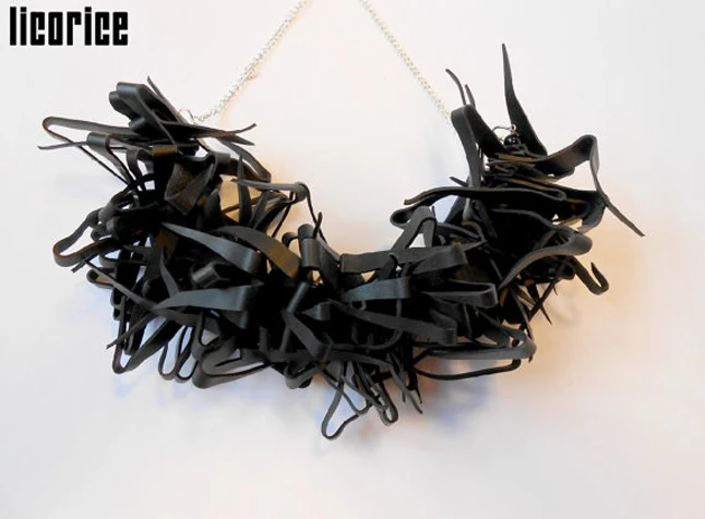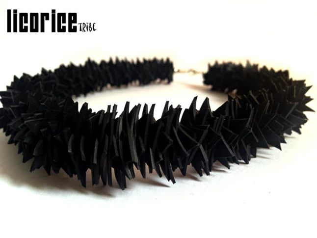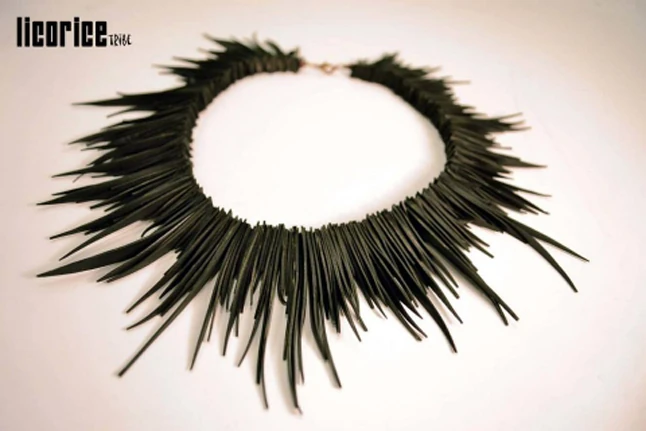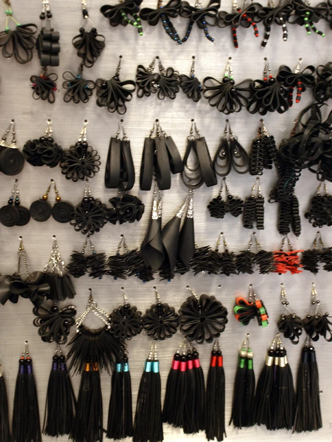 A tisztítással, előkészítéssel együtt három-négy óra. Egy nagyobb nyakláncba belemegy majdnem egy teljes kerékgumi, az utánpótlást a férjem hozza mindig, körbejárva a kerékpárszervízeket. Ékszerenként másfajta gumit használunk, néha van piros is, de nagyon ritka, egyszer volt egy limitált red kollekciónk. Vannak sablonjaink is most már, hogy egységes, utánrendelhető termékeket tudjunk készíteni. Egyenként, kézzel vágunk ki mindent, majd drótra fűzzük vagy a DNS termékcsaládnál lyukasztjuk a gumit. A fenntarthatóság nagyon fontos számunkra, hogy ha már újrahasznosítás, emberek csinálják, ne gépek, munkahelyet teremtsünk, piacképes termékeket hozzunk létre.