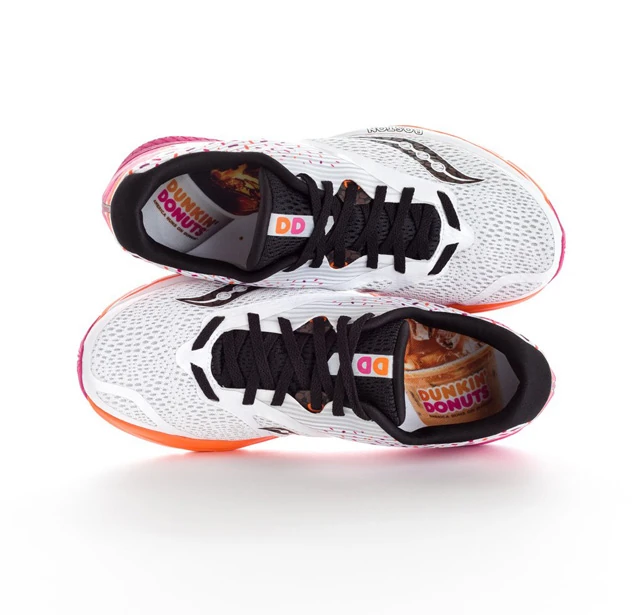 A Saucony a Dunkin` Donuts-szal lépett kollaborációra, így a márka lógója kávébab mintát kapott, a talpbetéten forró és jeges kávé látható, szóval ha belebújsz, SZÓ SZERINT kávéban futkorászhatsz a sportpályákon. A fánk motívum a cipő sarkánál és talpánál jön képbe, gyakorlatilag úgy fest, mintha beleléptek volna egy nagy adag pink-narancs cukros édességbe.
