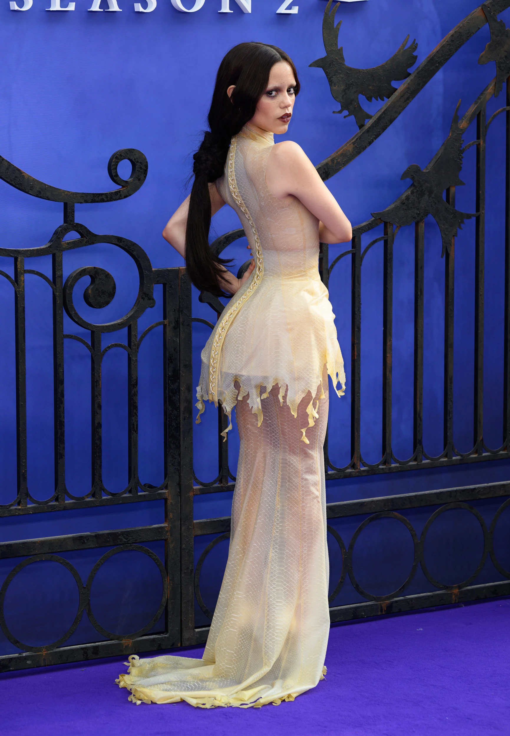 A 22 éves színésznő egy krémszínű Ashi Studio FW25 Couture kreációban vonult végig a vörös szőnyegen, amit Enrique Melendez álmodott meg. A finoman áttetsző, kígyóbőr ihletésű, testhez simuló, peplumos darab tökéletesen kiemelte Jenna alakját.