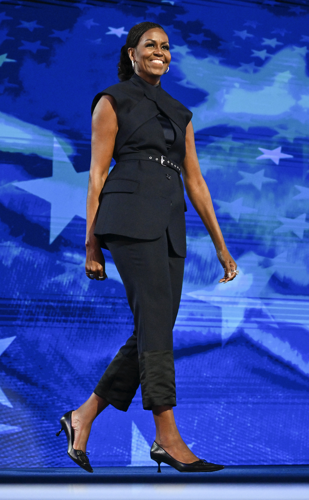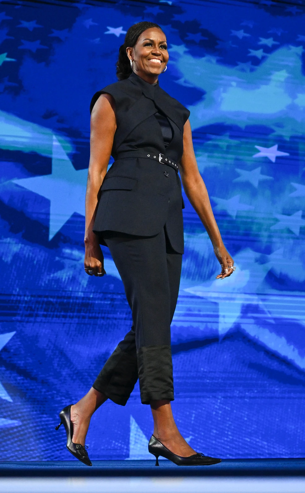 De nem mehetünk el Michelle Obama megjelenései mellett sem. Kamala Harris színeihez igazodva erre az eseményre egy Theory kosztümöt választott, ami egy merész és modern választás volt az egykori first lady részéről. Akárcsak ez a dekonstruált, ujjatlan sötétkék Monse öltöny, amely a klasszikus szabászatot tükrözi, modern felfogásban.