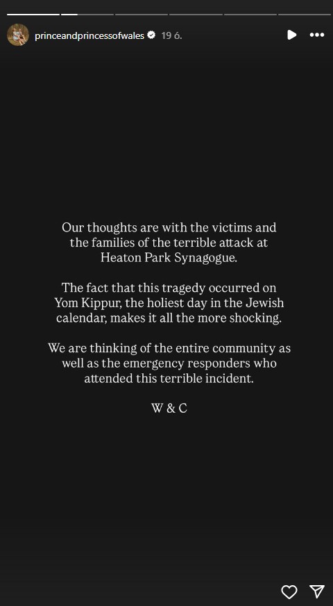 Katalin hercegné és férje közleményt adtak ki, mint írják, „gondolataink az áldozatokkal és családjaikkal vannak ezen a szörnyű napon”, hozzátéve, hogy a támadás időzítése még fájdalmasabbá teszi az eseményeket. Tragédiába torkollt ugyanis Manchesterben a jom kipur, a zsidóság legszentebb ünnepe (az engesztelés napja), amikor egy merénylő autóval a tömegbe hajtott a Heaton Park zsinagógánál, majd késsel támadt az emberekre.