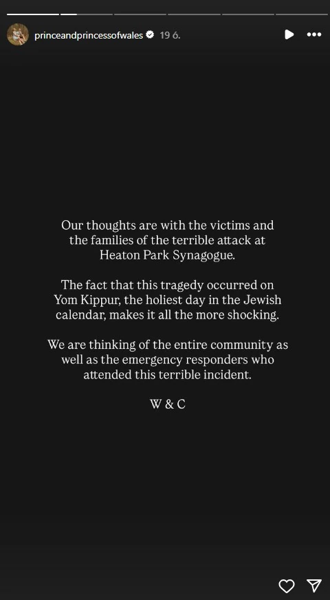 Katalin hercegné és férje közleményt adtak ki, mint írják, „gondolataink az áldozatokkal és családjaikkal vannak ezen a szörnyű napon”, hozzátéve, hogy a támadás időzítése még fájdalmasabbá teszi az eseményeket. Tragédiába torkollt ugyanis Manchesterben a jom kipur, a zsidóság legszentebb ünnepe (az engesztelés napja), amikor egy merénylő autóval a tömegbe hajtott a Heaton Park zsinagógánál, majd késsel támadt az emberekre.