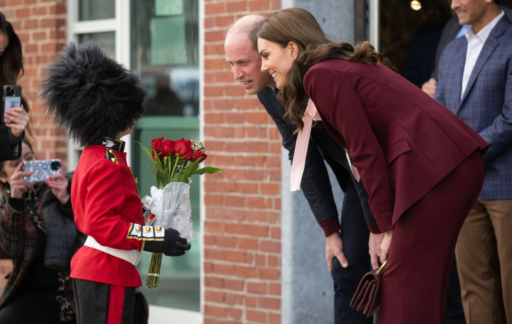 A helyszínen ráadásul egy kis királyi testőrnek öltözött rajongóval is találkoztak, aki egy csokor rózsát nyújtott át Katalin hercegnének – elbűvölő jelenet!