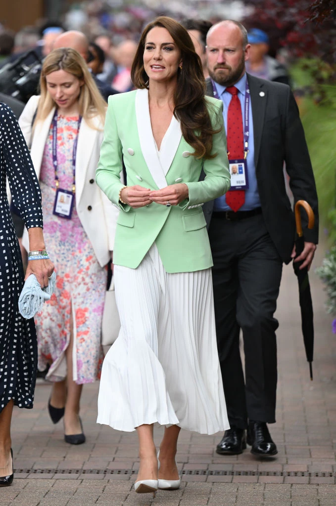 Katalin hercegné, az All England Lawn Tennis and Croquet Club (AELTC) védnöke a wimbledoni bajnokság második napján jelent meg idén először a tornán, hogy megnézze a brit játékost, Katie Boultert. Úgy tűnik, hogy a hercegné a pályai viseletből merített ihletet, ugyanis a fehér-zöld mellett tette le a voksát. Egy előkelőséget árasztó, fehér és rakott midiszoknyát viselt egy mentazöldszínű, 80-as éveket idéző, fehér gombos Balmain blézerrel. A megjelenést Shyla és Sézane ékszerekkel koronázta meg, valamint egy fehér Mulberry táskával egészítette ki.