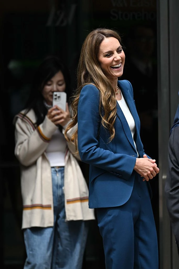 Katalin hercegné, aki a V&A védnöke, ezúttal egy olyan ruhát viselt, amelyet korábban már hordott. A tengerészkék blézer-nadrág kombinációt Sarah Burton tervező készítette az Alexander McQueen számára. Legutóbb ez a szett 2023 decemberében volt rajta, amikor az Evelina London Gyermekkórházba látogatott. Hosszú, gesztenyebarna haját most laza hullámokban hagyta, a ruhához pedig magassarkút, feltűnő fülbevalót és vastag arany nyakláncot választott.