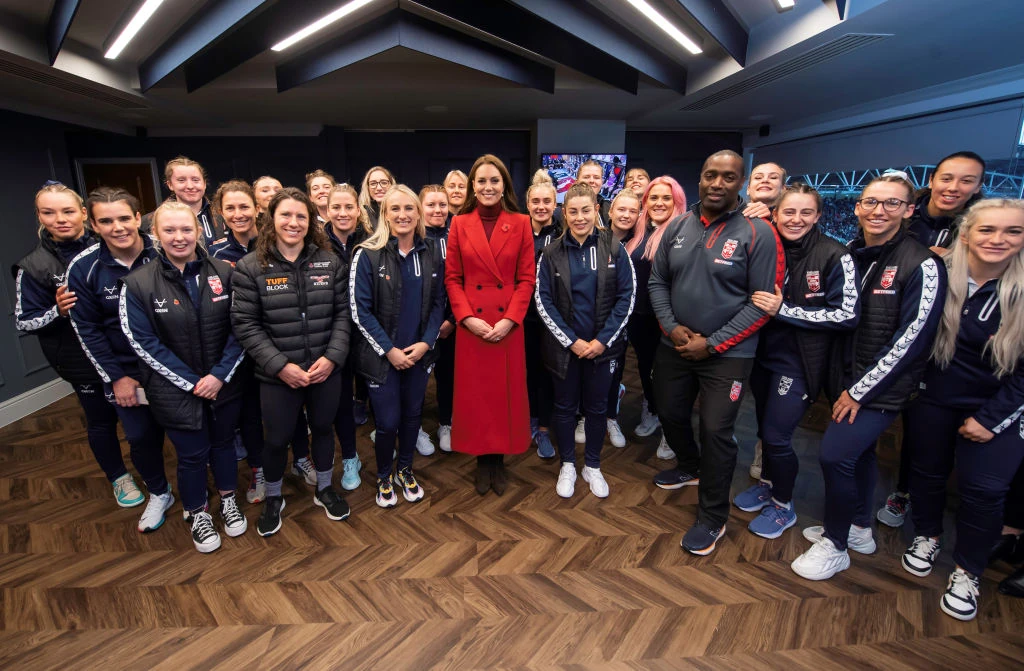 Katalin hercegné piros színben látogatott el, hogy királyi védnökként támogassa a Rugby Football League csapatait