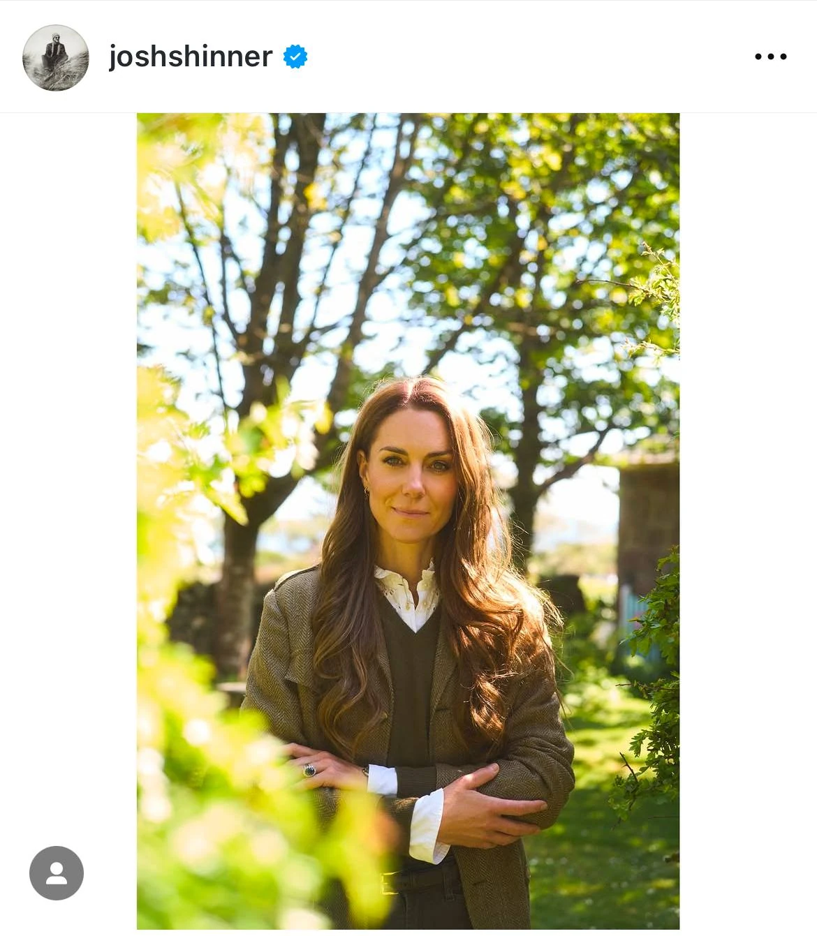 A képen Katalin hercegné egy tweed Ralph Lauren zakót, olívazöld kötött felsőt, fehér Boden blúzt és szűk farmert visel. A fotó különleges atmoszféráját az átszűrődő napsugár és a leendő királyné nyugodt, szemlélődő tekintete adja – a képnek a hangulata egyenesen éteri. A fotós, Josh Shinner így kommentálta a portrét Instagram-posztjában: „Remek társaság egy napsütéses, lombos sétához… Köszönöm, @princeandprincessofwales!”