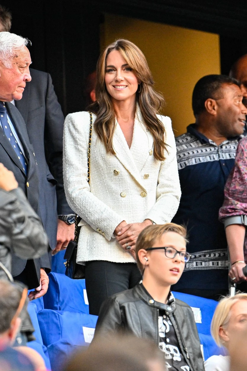 Katalin hercegné épp Angliának szurkolt a Fidzsi-szigetek ellen a franciaországi Marseilles-ben megrendezett tizedik férfi rögbi világbajnokság negyeddöntőjében, amikor luxus csavart adott egy régebbi fehér Zara blézerének fekete Chanel válltáskájával. Egyszerűen odavagyunk érte!