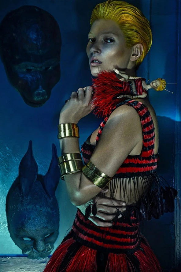 Steven Klein fotóin a modellt rövid, világossárga hajjal láthatjuk, ahogy a 2014-es tavasz-nyári kollekció harci szettjeiben néz vissza ránk. Teljesen libabőrösek leszünk annak a látványától, hogy néhány képen egy mini Kate Moss is látható, aki ugyanazt az összeállítást viseli, mint a modell.