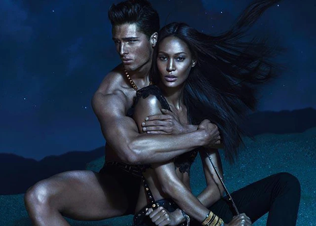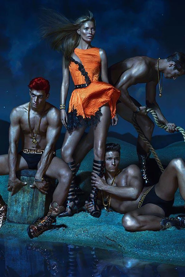 A kampányban három izmos modellfiú – Edward Wilding, Kacey Carrig, Veit Couturier – fölé magasodik a narancssárga-fekete csipkés Versace ruhába bujtatott szupermodell, aki talán még sosem volt ennyire barna. (Ha csipkelődő kedvünkben lennénk, azt gondolnánk, hogy biztosan Donatella Versace koncepciója volt ez a szoláriumtematika.) A kampányban feltűnik még Mert Alas & Marcus Piggott fotóin Daria Werbowy és Joan Smalls is.