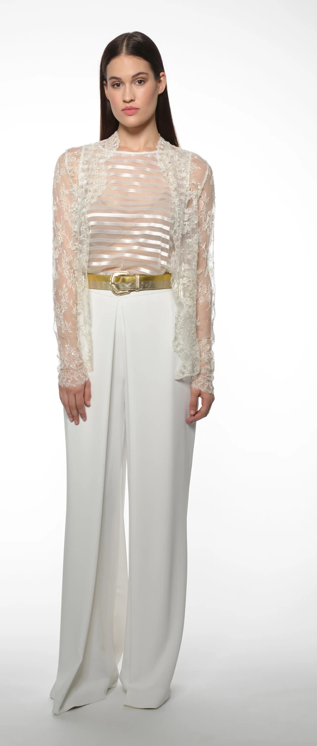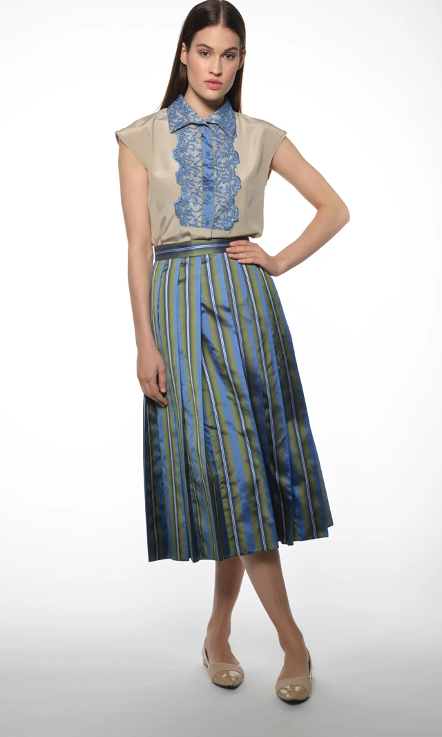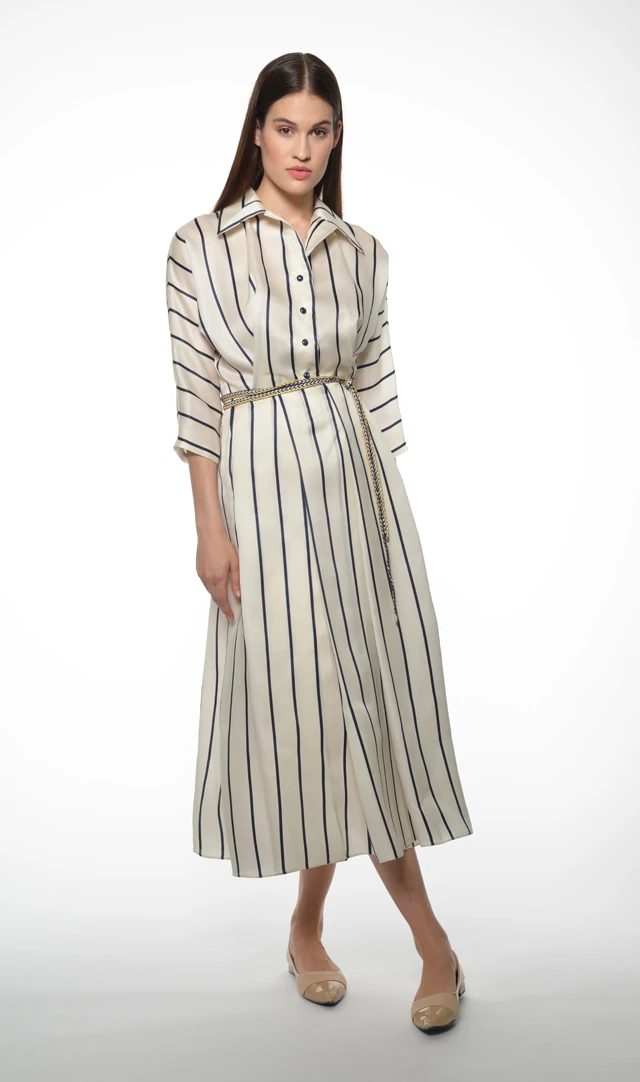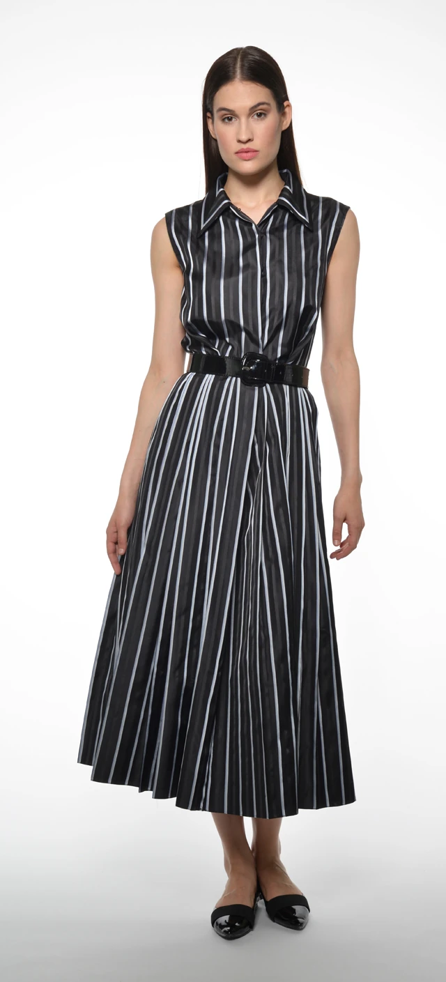 A trendteremtő hosszanti csíkozás is főszerepet kap a kortárs eleganciájú ingruhákon - a kontrasztos színkombinációk mellett - többek közt - a szofisztikált törtfehér és a leheletfinom halványkék is a kollekció alaptónusaként jelenik meg.