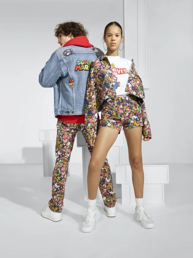 A kollekciót magát élénk, telített színek és grafikák jellenzik, és természetesen a rajongók kedvenc karakterei: Mario, Luigi, Yoshi és Barack hercegnő. A Super Mario™ elemek nemcsak grafikaként jelennek meg a pólókon, hoodie-kon és farmereken, hanem olyan részletekben is, mint a farmerek zsebéből kikandikáló aranyérmék vagy a gombák és a csillagok a Levi's? címkéken, illetve a piros, kék, zöld és sárga gombok. Az 501? '93 farmer szárának belső varrására egy egyedi ‘POWER UP' szalag került, a derékpánt belső oldalán pedig maga Mario fut körbe.
