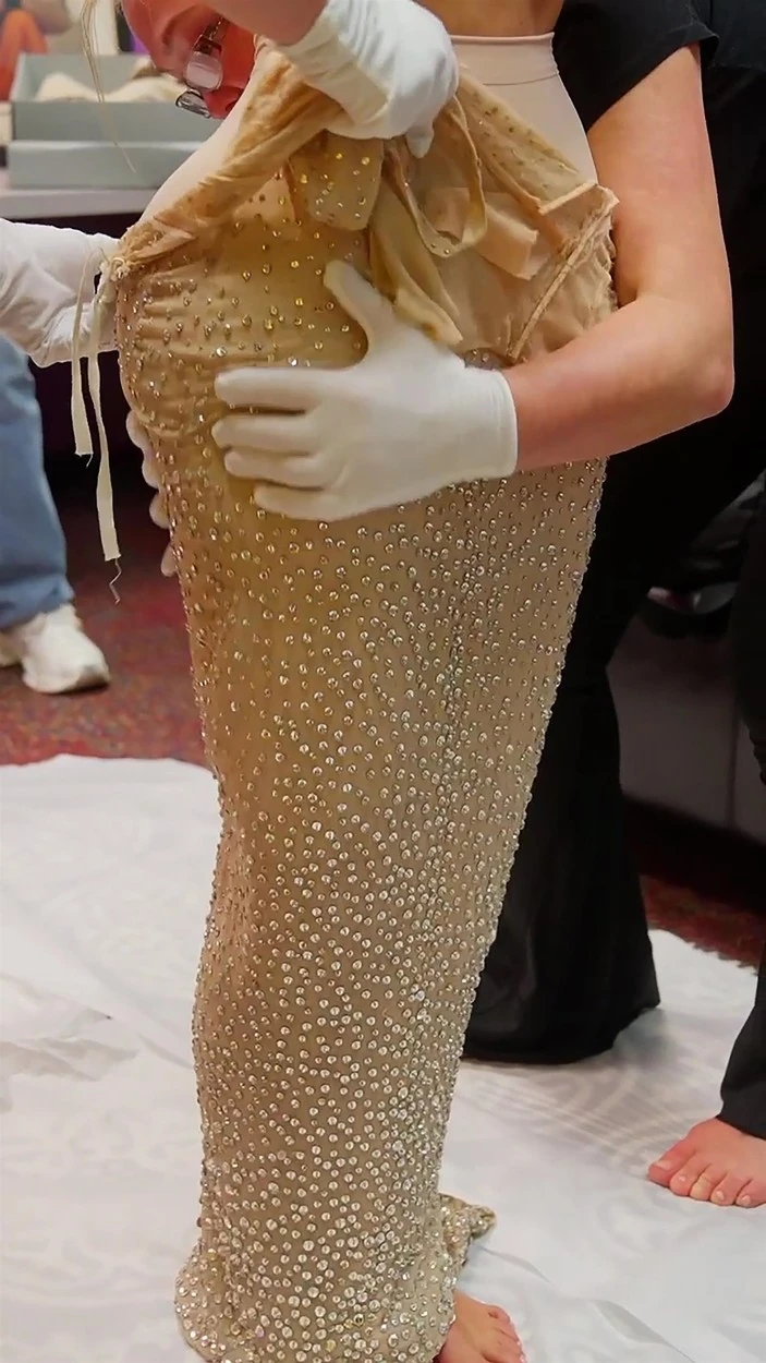 Kim ugyan csak pár perc erejéig bújt bele az eredeti ruhába, de jobban tette volna, ha inkább egész este a replikát viseli. A hatvanéves estélyi 5 millió dollárt ér, így jelenleg a világ legdrágább ruhakölteményeként tartják számon – nem véletlenül, hiszen eszmei értéke és történelmi jelentősége felbecsülhetetlen. A rendkívül érzékeny ruhát hőszabályozott térben, múzeumi körülmények között szükséges tárolni, átszabni pedig természetesen nem lehet (Kim 16 kilót dobott le, hogy belepasszírozza magát).
