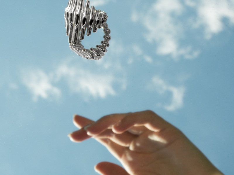 Katáék tavaly év végén kerestek meg, konzultáció és megismerkedés után jött az ötlet a kollaborációra. A Milánóban bemutatott ruhákkal együtt jelentek meg az általam tervezett ékszerek. A tárgyak digitálisan generált hullámfelületek projekciói, egy generatív folyamat végeredményeképp lézeres 3D nyomtatással készültek.