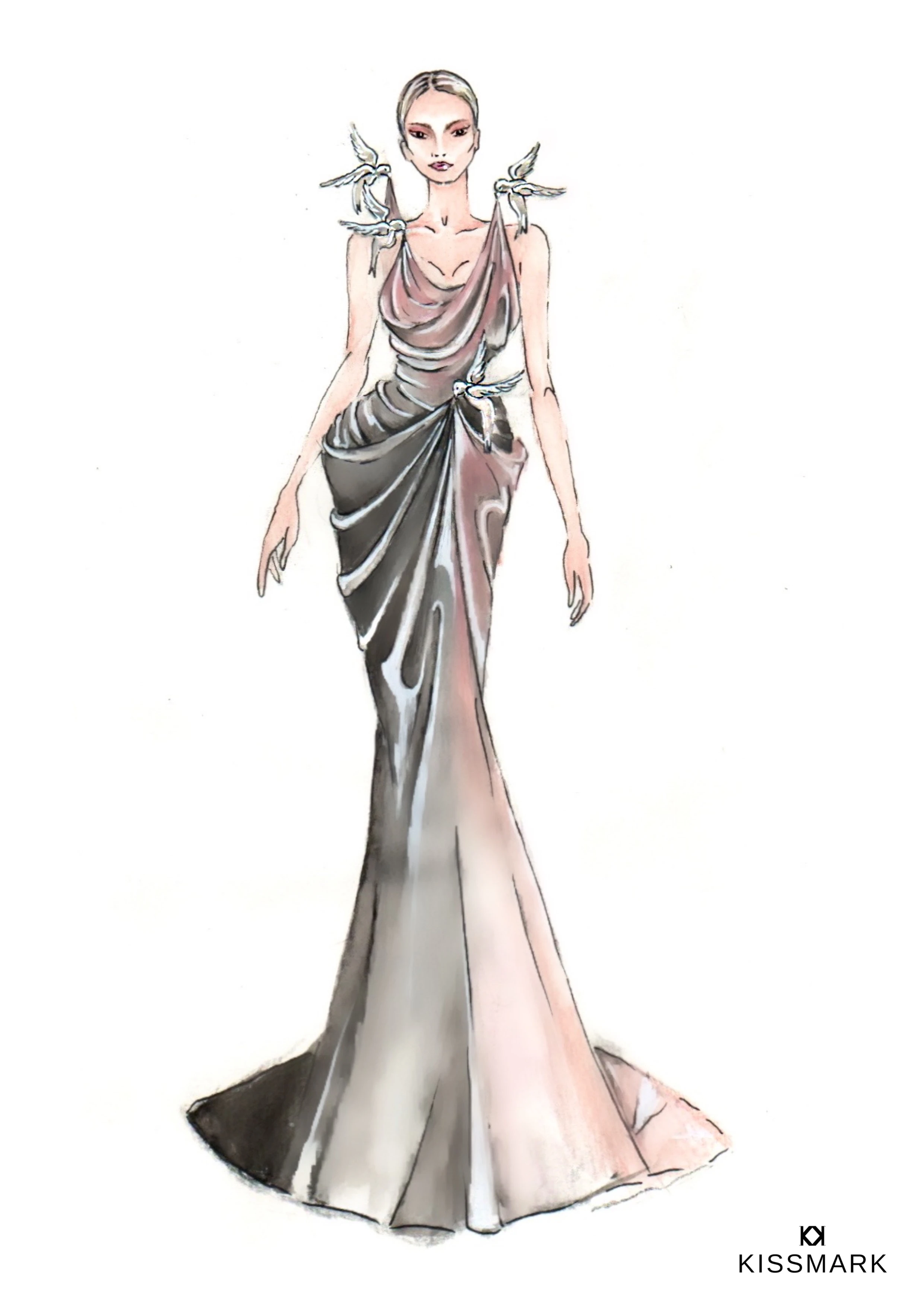 A ruha lényege egy mesebeli, szürreális jelenet megelevenítése. Nem szerettem volna erről elvenni a fókuszt egy texturált vagy mintás anyaggal. Ezért a választásom egy könnyed, átmenetes (rózsaszínből szürkébe áthaljó) csodás szaténra esett.