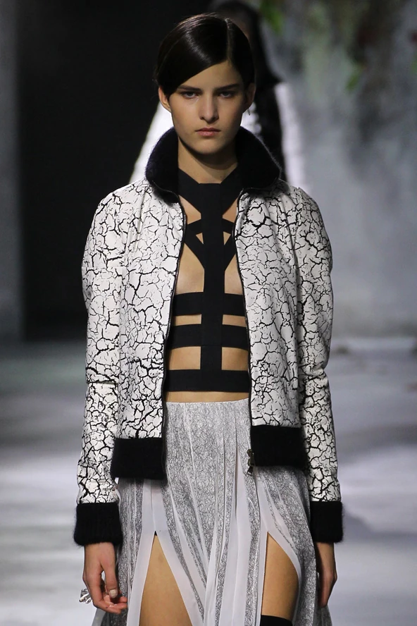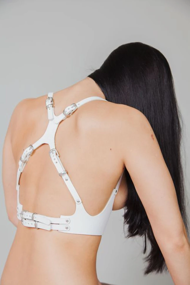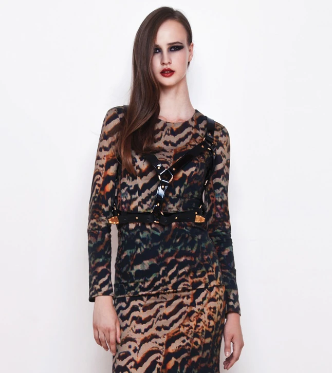 Mojzes Dóra korábbi kollekciójának egy lookja, a hámot Mrs. Herskin készítette: