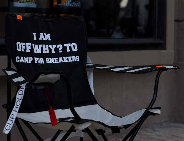 A "kempingfelszerelés" fő eleme egy finom gondossággal szétgányolt kempingszék, melyet Virgil Abloh, az Off-White márka atyjának "dekonstrukciós" elevei alapján raktak össze (szét) a csapat tagjai. Egy kis "mellékinformáció", hogy a széket inspiráló egyik ilyen Off-White x Nike cipőért jelenleg is több mint 2000 dollárt kell leszurkolnia annak, aki szeretné beszerezni.