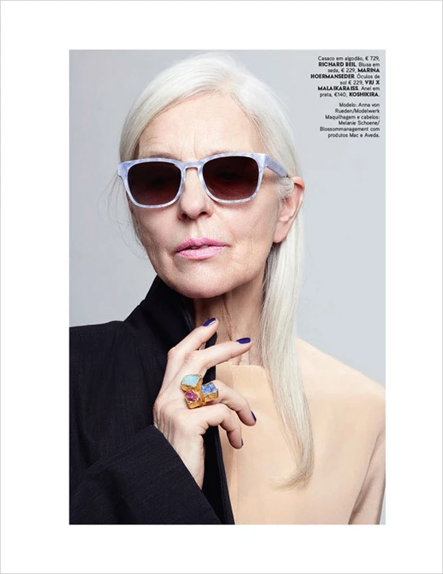 A portugál Vogue magazin legújabb divatanyaga most arra hívja fel a figyelmet, hogy a stílusosság, és a női szépség is kortalan. A Frauke Fischer által fotózott divatanyaguk modellje a most 65 éves Anna von Rueden, aki már jócskán 50 felett járt, amikor felfedezte magának a divatszakma. A nagymama korú német modell azóta is kampányok, sőt divatmagazinok kedvence. Anna nem látszik fiatalabbnak a koránál, viszont csodásan mutat a képeken, fantasztikus kisugárzása van!