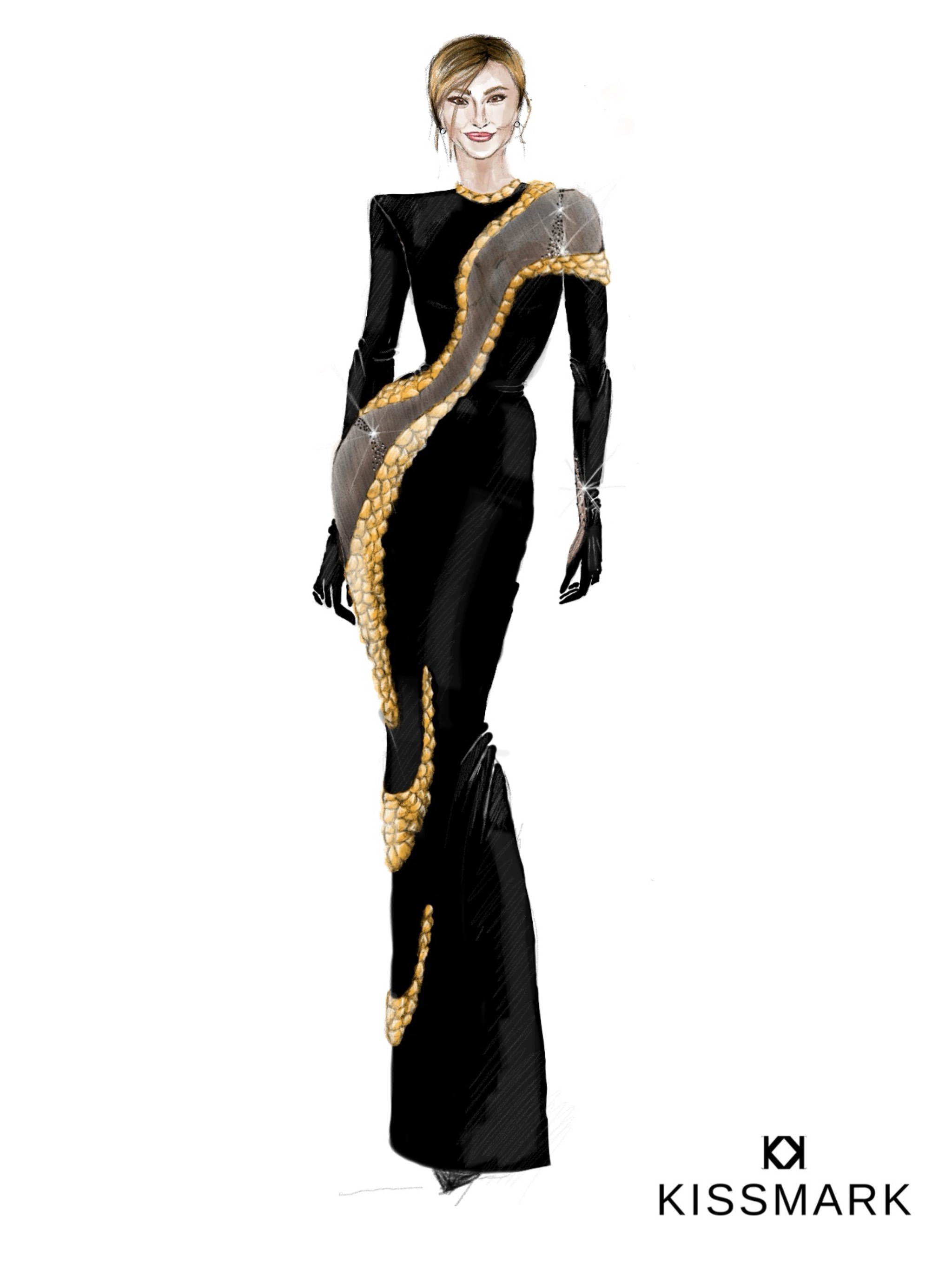 A díszítésről is Márk gondoskodott saját kezűleg: „Ezúttal is én hímeztem rá ezeket a fémlapocskákat, amik eredetileg nyakláncok voltak... ez most tizenöt óra munkát jelentett.” A díszítés zsindelyszerűen követi az áttetsző dekoltázst, kígyószerűen fut végig a ruhán, ami egy kicsit osztrigaszerű hatást kelt. A minimális strasszdíszítés „kaviár” effektként helyezkedik el a képzeletbeli melltartó és bugyi vonalán, fokozva a luxus és érzékiség benyomását.