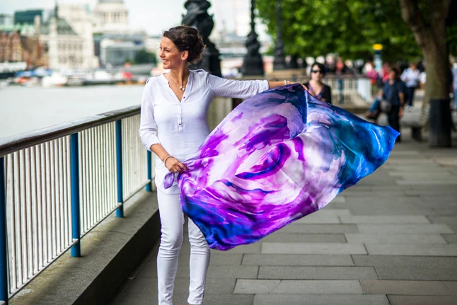 London a lehetőségek városa, de ez nem jelenti azt, hogy azonnal a siker kapujában találod magad. Ha megszületik a fejemben egy adott kollekció, először megfestem kézzel a mintadarabot, majd ennek mintájára digitális nyomtatással készül el a többi kendő. Nekem első körben meg kellett találnom azt a céget, aki a legjobb minőségben tudja ezt kivitelezni. A tökéletes cég pedig nem biztos, hogy ott van az orrod előtt. Más országokban is keresgéltem, Olaszországban, Japánban is nézelődtem és végül mégiscsak egy angol cég mellett döntöttem. Az indulástól kezdve fontos volt nekem, hogy egy luxusmárkát akarok építeni, az Angliában gyártott termék pedig minőséget képviselnek.