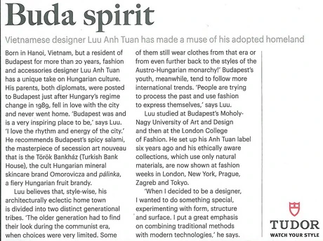 A StyleFile főszerkesztője régóta ismeri a brandet és személyesen Tuant is, és a mostani, országokról/városokról szóló sorozat jó alkalmat nyújtott Budapest és az Anh Tuan brand szerepeltetésére online és a nyomtatott verzióban is.