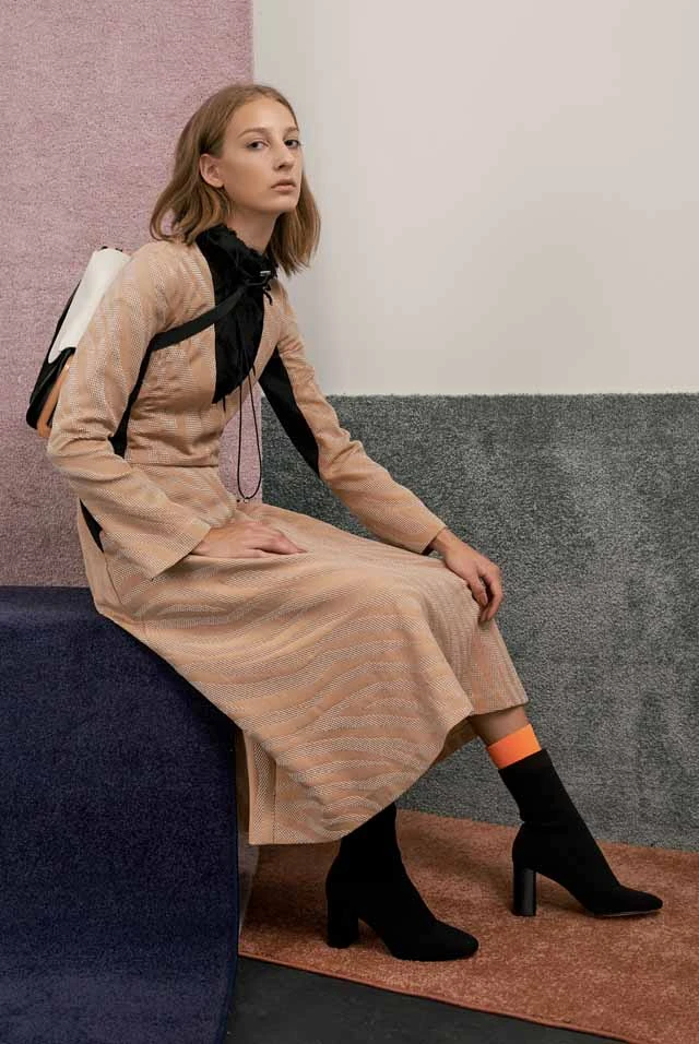A színeket a felhasznált két jacquard szövet hozza össze. Az ABC-mintás anyag a kollekció összes színét tartalmazza: feketét, fehéret, teveszínt, púderszínt és neon narancsszínt.