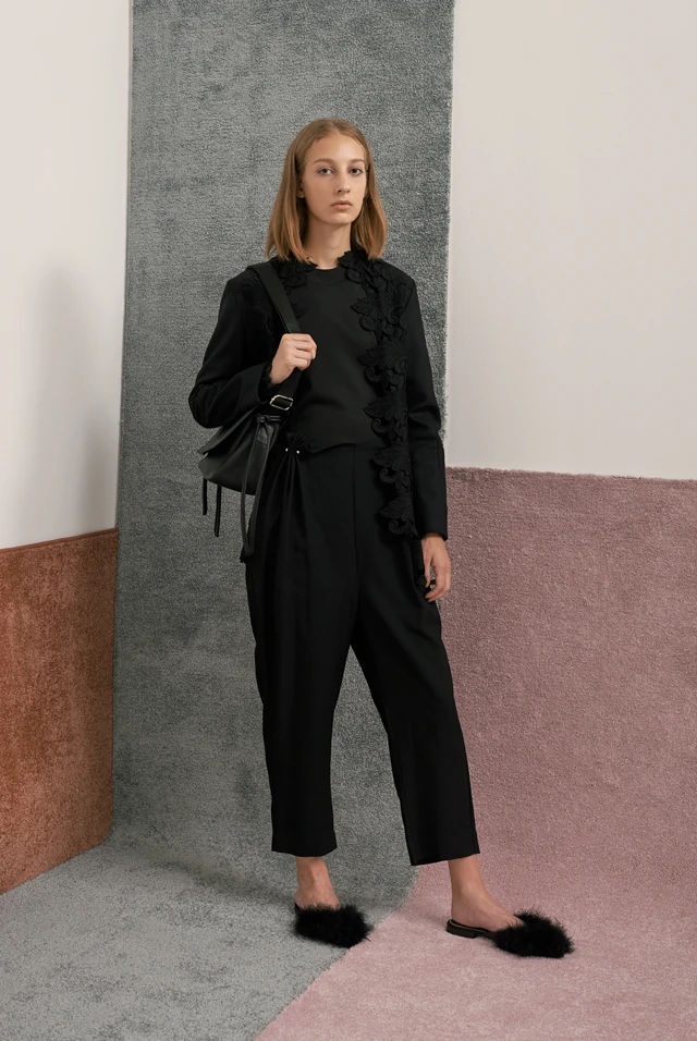 A fekete-fehér kontrasztját a jógázó alakokat ábrázoló mintás anyag lágyítja. A romantikus csipkemotívumot hímzett orkán, a gyapjúszövet áttört csipkemintázatát pedig a ruhák sportos szabásvonalai