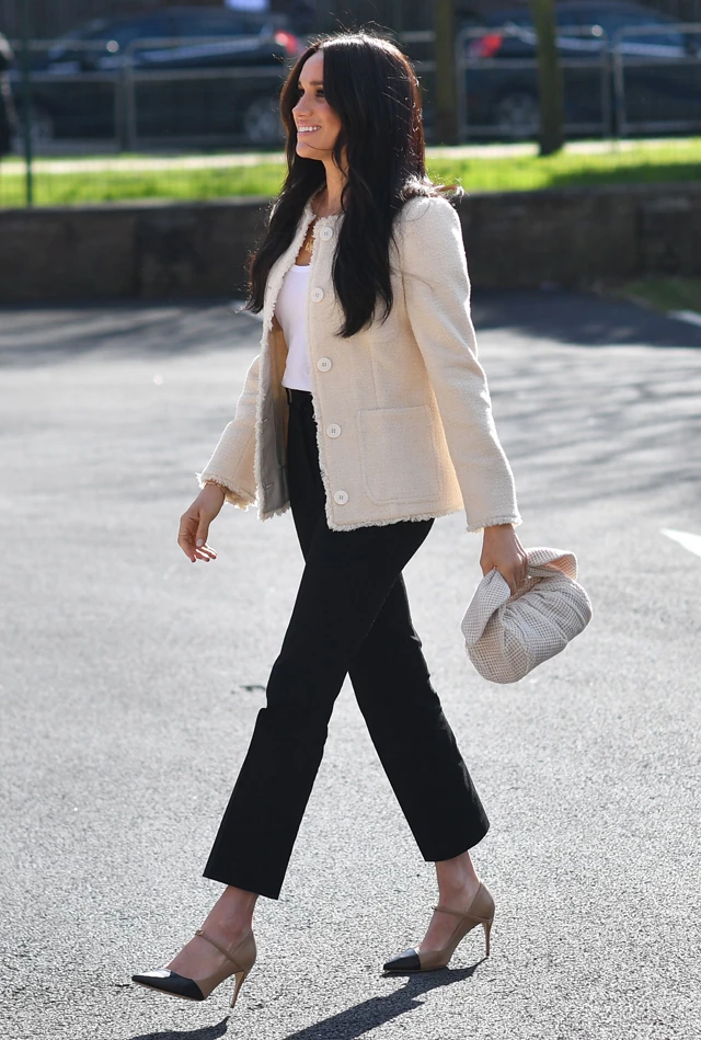 Meghan egy krémszínű blézert, vágott fekete nadrágot és egy nagyon cuki kistáskát viselt a fent említett tervezőtől.