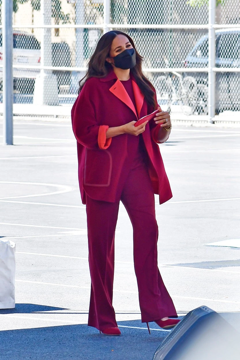 Az első két napban Meghan többnyire fekete, komolyabb szetteket viselt, de a második nap végén monokróm burgundi szettjével már jelezte, hogy lesznek itt még meglepetések.
