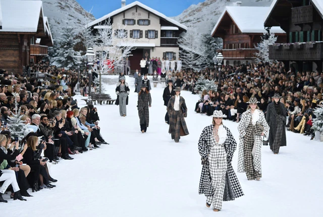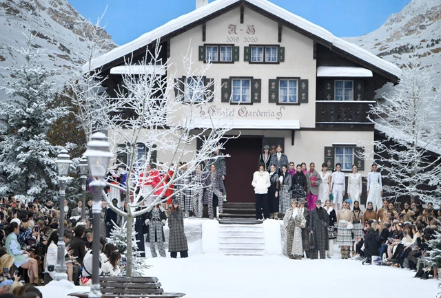 Erre, mármint Lagerfeld kéznyomára utalt a bemutató díszlete is. Mintha egy svájci, vagy német, de mindenesetre az Alpokban található faházas sífalu elevenedett volna meg a divatbemutatón. A hófödte tájra léptek elő a központi faházból a show modelljei.