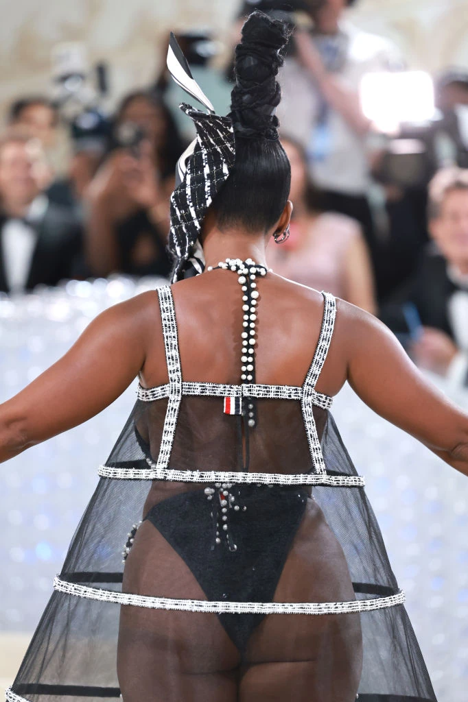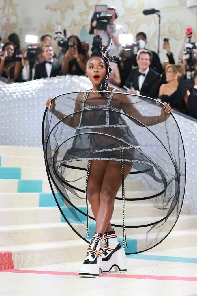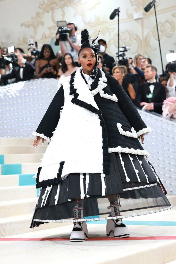 Monáe egy merészen túlméretezett, félig fekete, félig fehér Chanel-ihlette tweedruhát is viselt a Met-gála fehér szőnyegén. Később levette a túlméretezett kabátot, hogy felfedje alatta a fekete bikinijét. „Istenem, ez annyira Thom Browne! Igazából a zenei karrierem kezdete óta dolgozom Thom Browne-nal" - mondta Monáe a THR-nek a vörös szőnyegen, és úgy jellemezte a megjelenést, mintha „Thom Browne, Karl Lagerfeld [és] Janelle Monáe tervezte darabban lenne." A 2023-as Met-gálán olyan hírességek is Thom Browne-t viseltek, mint Sora Choi, Trevor Noah, a The Last of Us sztárja, Bella Ramsey és az Elvis rendezője, Baz Luhrmann.