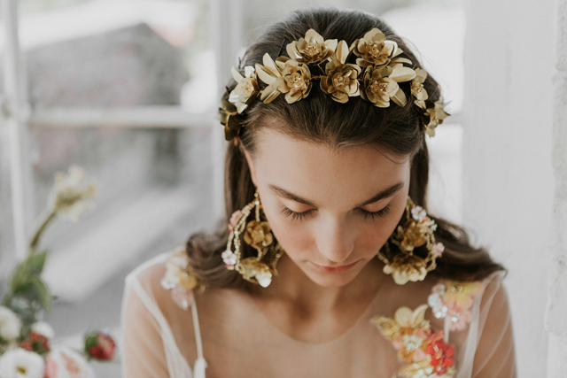 A szimpla fehér, illetve az arany és barackos színben játszó díszekkel tűzött, kombinálható alsó és felsőrészek mellé a Studio Larinne készített kiegészítőket. A virágos, leveles fejdíszeket babérkoszorúk és antik hercegnők ékei, a színes, légies fülbevalókat a titokzatos mesebeli királylányok inspirálták.