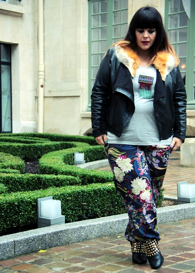 Ehhez nem sokat fűznék hozzá, csupán annyit, hogy személy szerint a pulóver+szoknya+magassarkú outfittel bármikor őrületbe kergethettek. Tudom nagy trend idén, de ezt kérlek benneteket plus size lányok, ne tegyétek. Más dolgokkal könnyedén elérhetitek a kívánt hatást, nézzétek csak meg Stephanie Zwickyt! A selyem virágmintás nadrág és a szegecses bakancs önmagában is sikkes, a kiegészítők pedig csak dobnak az egészen. Imádom.