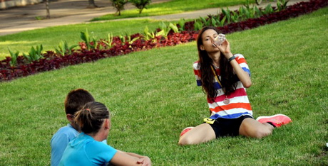 De miután sikeresen hazaértem, gyorsan összefutottunk Johannával, átadtam az egyentopot, megbeszéltük a legfontosabbakat: ki milyen naptejet visz, hallgatunk-e zenét, meddig megyünk együtt, hogy megyünk ki, hova pakoljuk a cuccot, mennyire izgulunk stb. És vasárnap reggel már alig bírtunk magunkkal. Csak 12-kor indultunk Békéscsabáról busszal Pusztaottlakára, ugyanis innen kellett befutni a csabai városháza elé. A rajt 14 órakor volt, a lehető legnagyobb hőségben... Ez a 2 óra elég nehezen telt el, már nagyon indulásra készek voltunk, de még gyorsan csináltunk egy rajt előtti fotót, Hani elkortyolta az utolsó energiaitalt, én felpakoltam zsepivel, kenegettük magunkat naptejjel, engem ugyanis két hete azzal kínoz a párizsi ügynökség, hogy folyamatosan barnulok és vigyázzak nagyon.