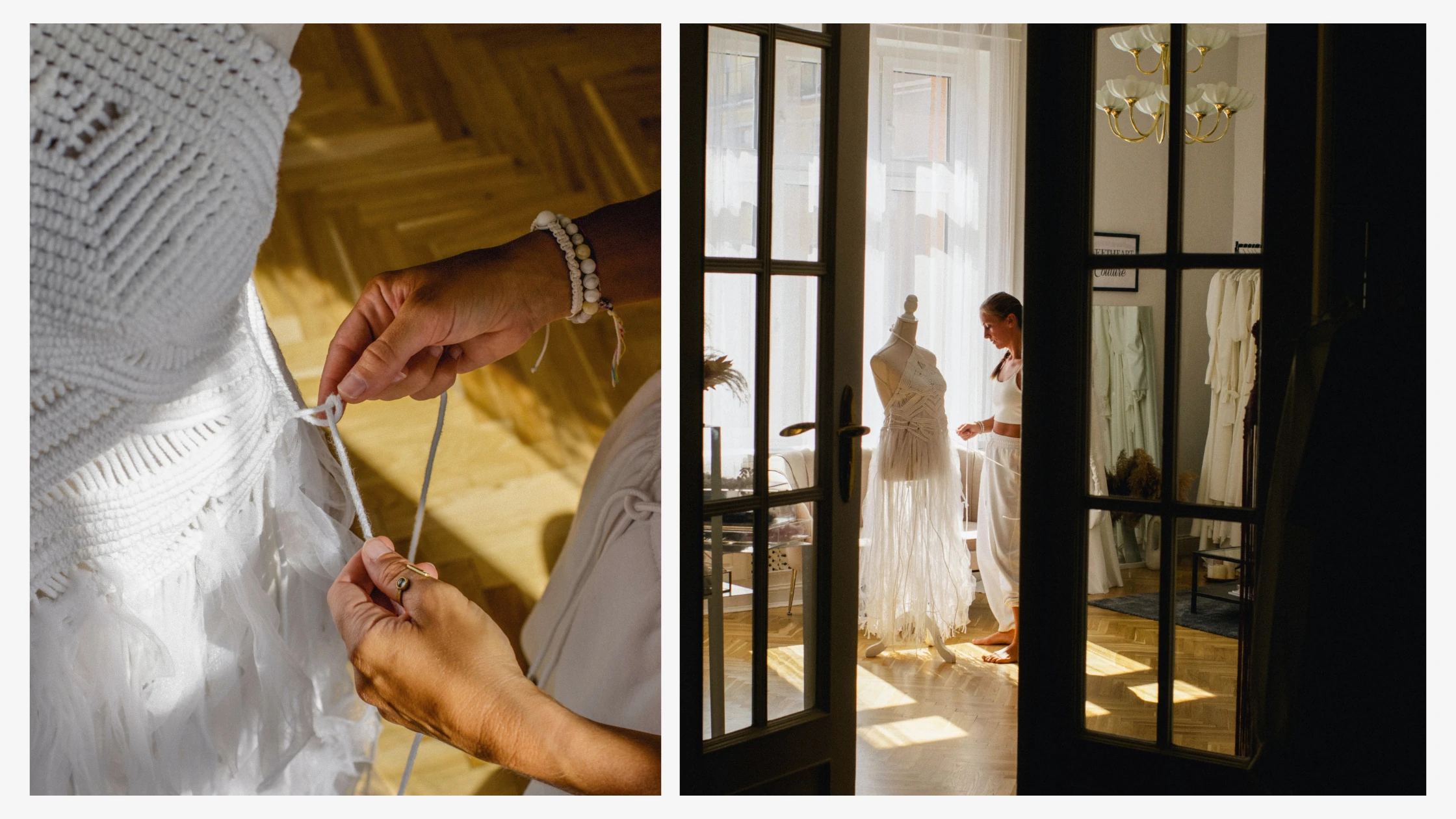 Mielőtt belekezdünk az élménybeszámolóba, szeretném bemutatni a DADO Macramewonders márkát. Az idén 6 éves DADO Macramewonders az első hazai márka, amely macrame menyasszonyi és alkalmi ruhák alkotására specializálódott. A kézi csomózás és kézi varrás újhullámos fúziójával készülő fonalruhák több 1000 csomót rejtenek.