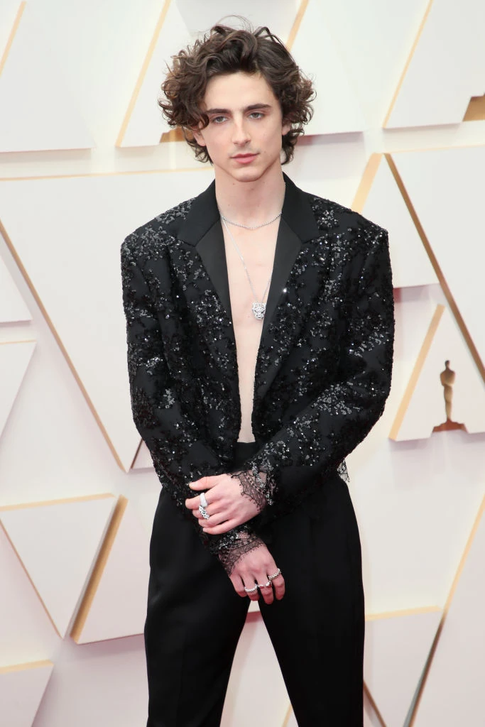 De nem ez volt az egyetlen alkalom, amikor hátat fordított a maszkulin vonalnak. Timothée Chalamet egy fekete flitteres Louis Vuitton öltönyben érkezett a 2022-es Oscar-gálára. A különleges darab Nicolas Ghesquière tervező munkája, ami a Louis Vuitton 2022-es tavaszi-nyári női kollekciójába tartozik. Az öltönyt elegáns szabása és letisztult vonalvezetése miatt bárki felveheti, ezzel pedig Chalamet bebizonyította, hogy a divat nem a nemek meghatározásáról szól. Ami a Cartier ékszereket illeti, a fehérarany gyűrű és nyaklánc volt az outfit stílusos megkoronázása.