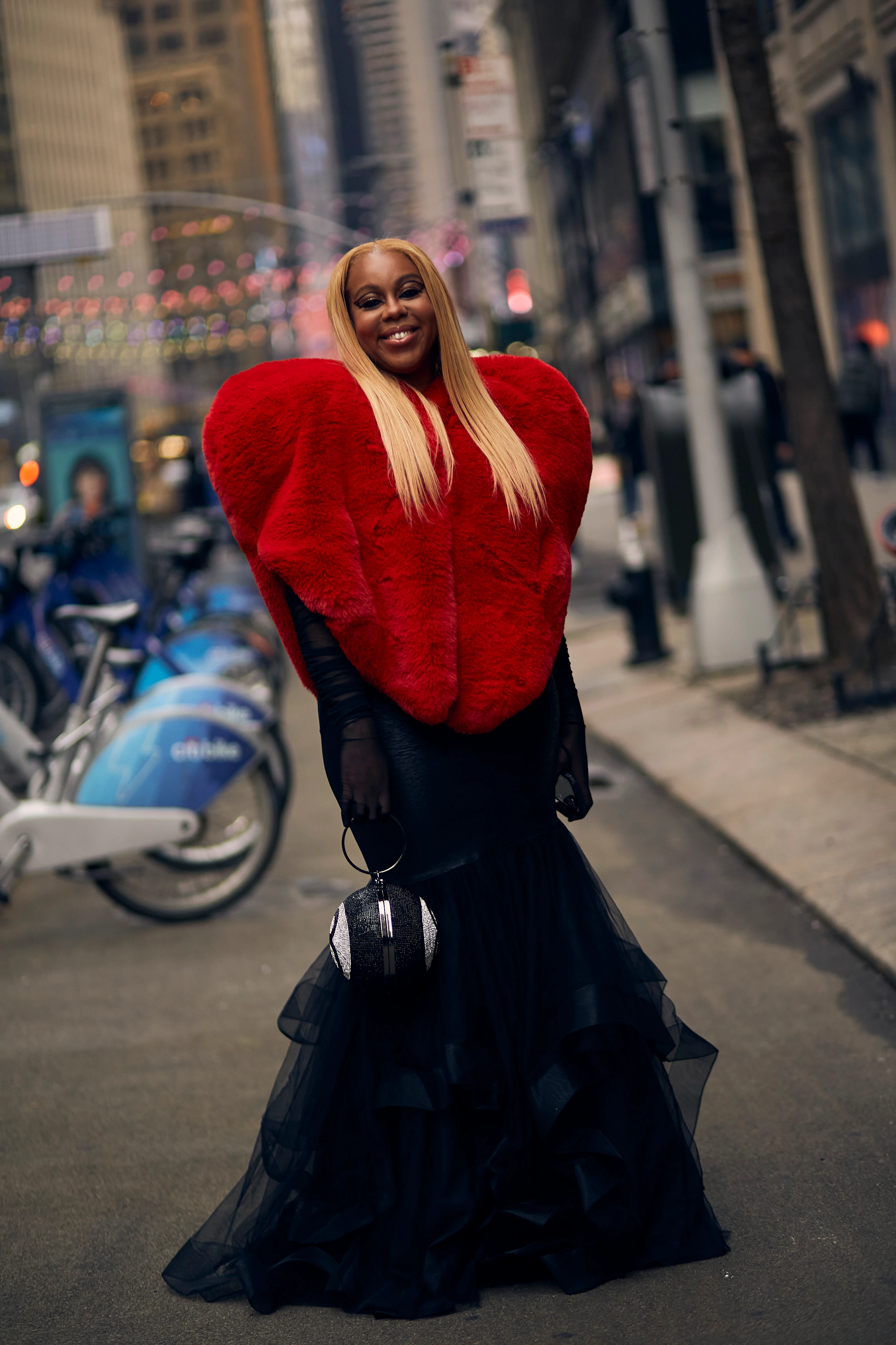 A szívet formáló szőrmés poncsó mesésen mutat a fekete estélyi felett