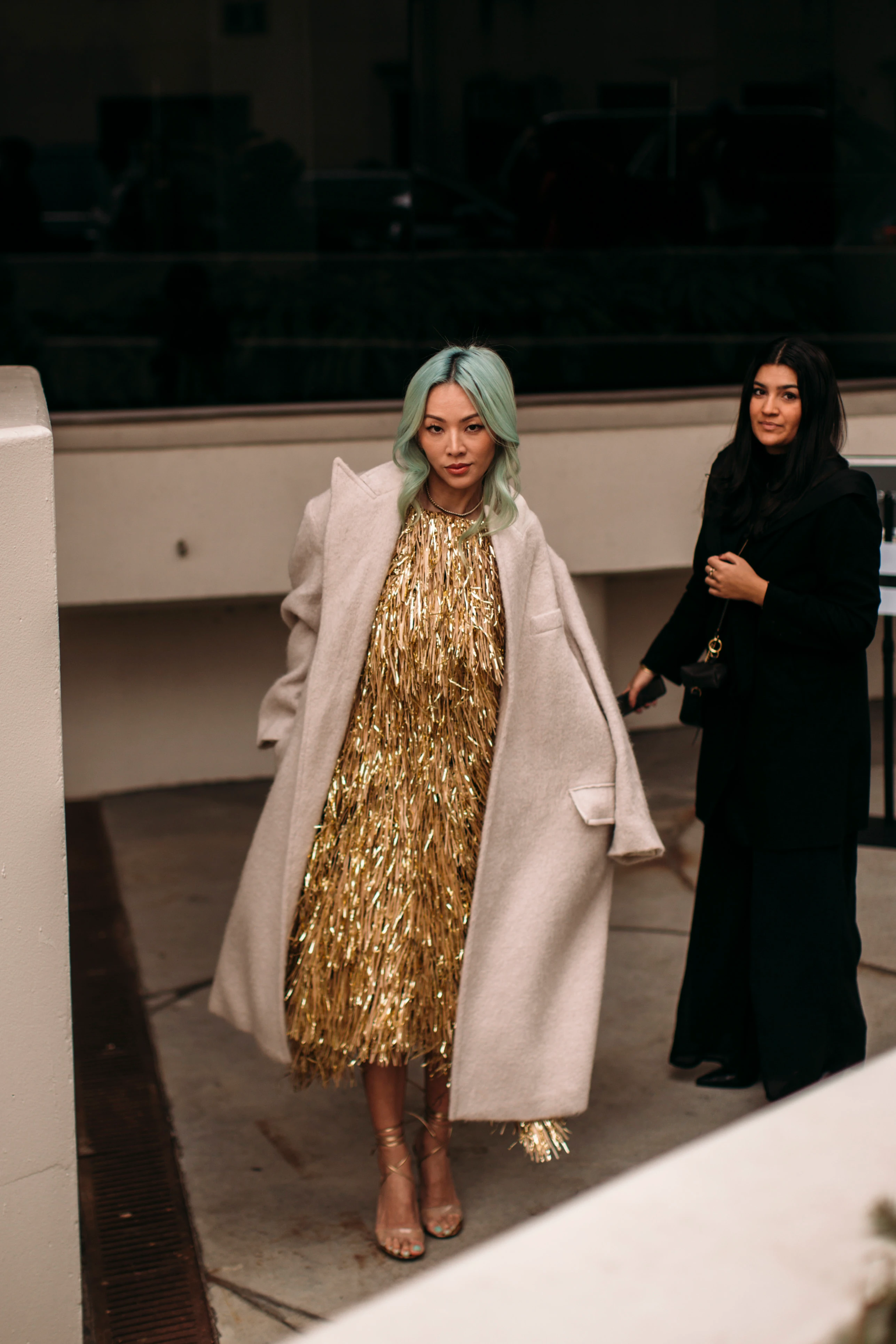 A Proenza Schouler bemutatójára a televíziós személyiség egy áttetsző arany midi ruhát választott, amelyhez egy fekete-fehér kabátot viselt.