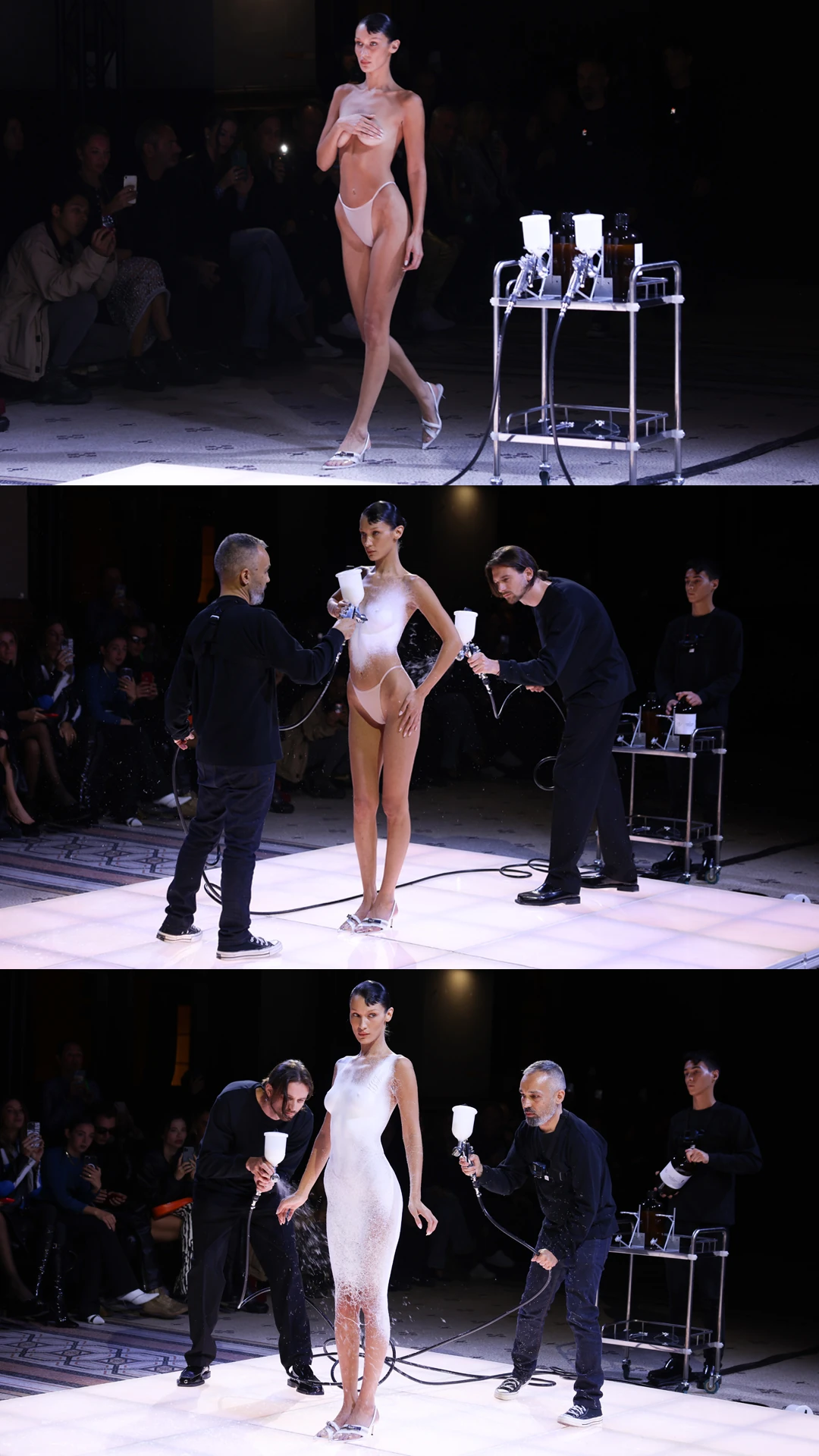 A leglátványosabb, legtöbbet említett, legemlékezetesebb pillanata az egész szezonnak a párizsi divathéten bemutatott ruha, amit a Coperni tervezői egyenesen Bella Hadid testére fújtak. A gyönyörű hófehér anyagot a Fabrican nevű technológiai cég találta ki. Megdermedés után a ruha kapott egy kis formát, majd Bella Hadid körbe is sétált benne, hogy bizonyítsa az anyag kiválóságát. A különleges záróműsor sokakat Alexander McQueen robot által festett ruhájára emlékeztetett, ami bevalljuk, tényleg hasonlóan nagysikerű történelmi pillanat volt, mint a Coperni bemutatóé.