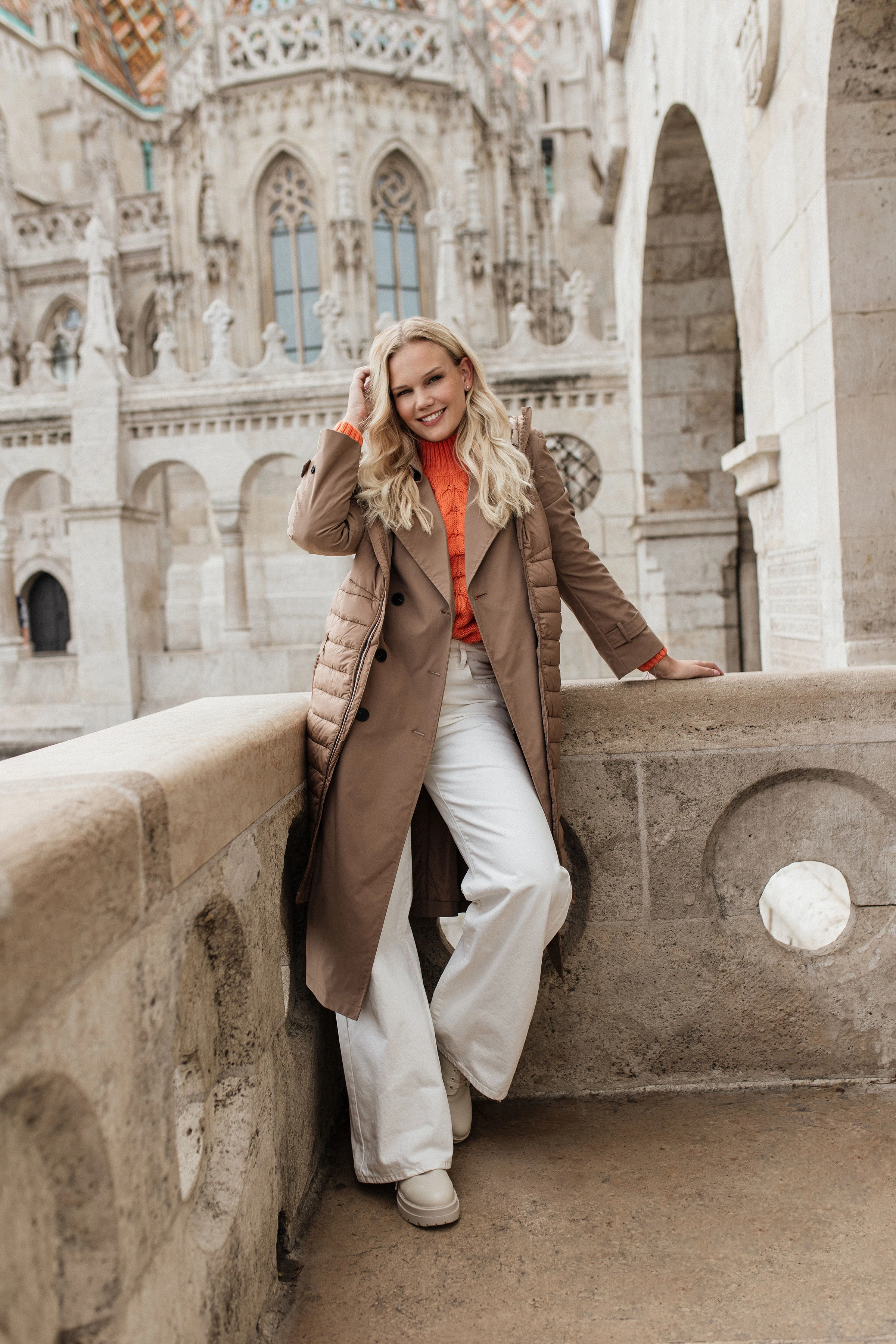"Minden egyes vásárlás alkalmával egyre jobban megkedvelem a márkát. Nagyon puha, minőségi alapanyagokkal találkoztam eddig, és számomra a szabások is mindig tökéletesek. A gyermekosztályt pedig már évek óta gyakran látogatom, így az is nagyban megkönnyíti a vásárlást, hogy számos dolgot a családnak egy helyen tudok beszerezni. A C&A prémium kollekció mindig a kedvencem, ahol rengeteg nőies ruha közül lehet válogatni. A fotózáson a kedvenc szettem - annak ellenére, hogy a narancssárga szín eddig nem volt a kedvencem -, pont az az összeállítás lett, ahol a narancs pulcsit viselem. A barna kabát lágyította az élénk színt, és szerintem egy szuper őszies szett lett belőle."