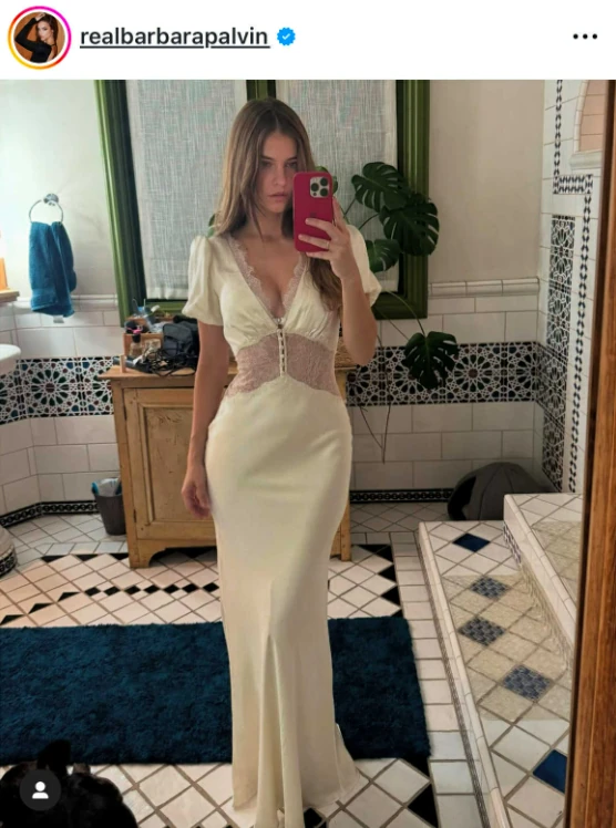 Palvin Barbara legfrissebb Instagram-bejegyzésében egy hófehér, szaténhatású ruhát visel, amelyet finom csipkebetétek tesznek igazán különlegessé. A mélyen dekoltált, testhez simuló darab tökéletesen kiemeli Barbara nőies alakját, miközben megőrzi az eleganciát. A kép hangulatát a természetes smink és a laza, kiengedett haj teszi még letisztultabbá.