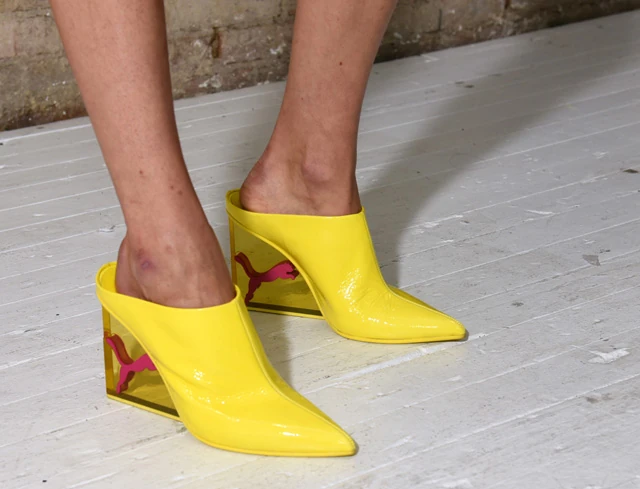 Az énekesnő tervezői karrierjének már eddig is a fontos alappillérei voltak a cipők, és talán emlékszel még rá, hogy a fürdőpapucs felpimpelt változatát Rihanna helyezte a divattrendek első sorába. A lábbeliken való ügyködés most is elég erősre sikeredett. A telisarkú sport Puma az élénk színeivel egészen mellbevágó látvány volt, de mégis meg kellett egyeznünk abban, hogy ez kifejezetten sikkes volt, a flip-flop papucs és a tűsarkú keresztezésével létrehozott szörnyszülötthöz képest. Elképzelhető, hogy Rihanna ezt a darabot is sikerre viszi, de első pillantásra iszonyatos.