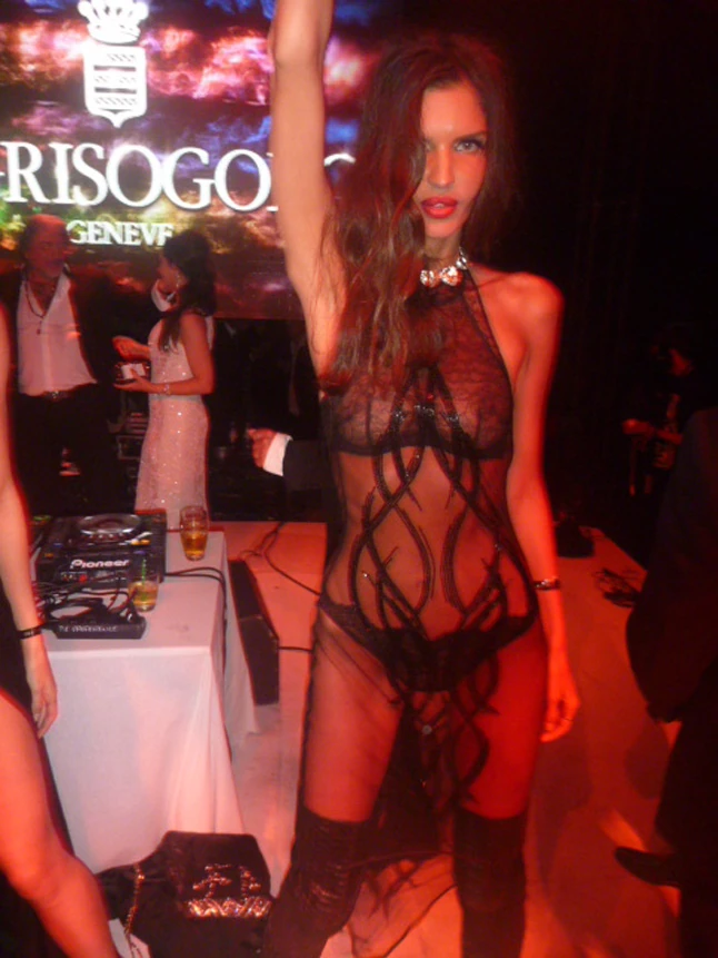 Ismét rátaláltam az este legmeghökkentőbb összeállítására. Az illető egy modell volt, és egy teljesen átlátszó, fekete ruha volt rajta, ami alatt csupán egy áttetsző, fekete, csipkés tanga bugyit, illetve ugyancsak átsejlő, fekete csipkemelltartót viselt.